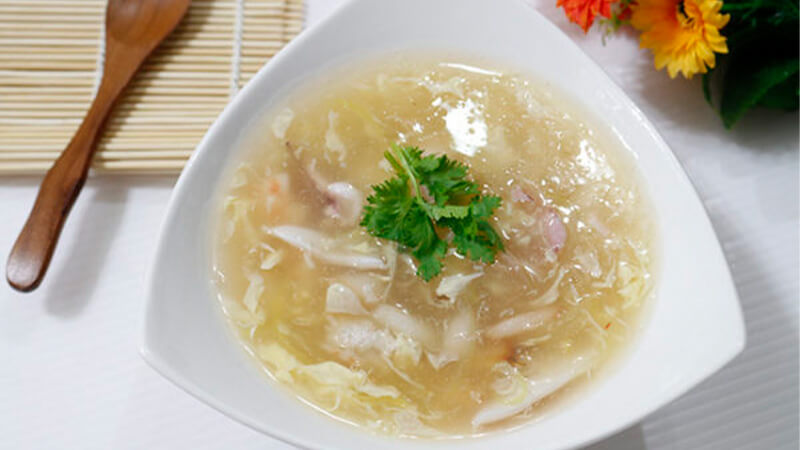 Đun sôi nước dùng. Thả cua, ức gà, bột năng vào trước, quậy cho sánh, rồi đập 2 quả trứng gà vào khuấy từ từ.