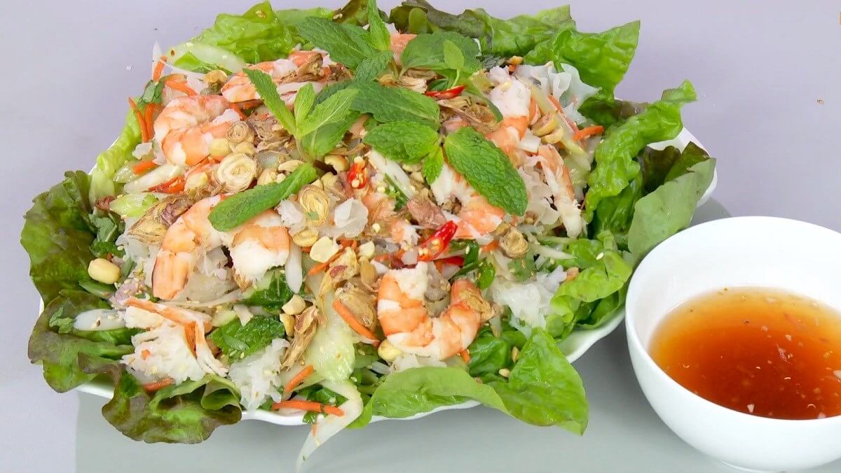 Món gỏi này ăn kèm với bánh phồng tôm khai vị rất hợp.