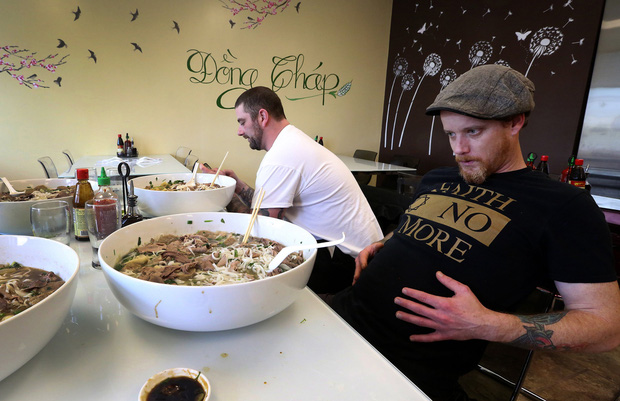 Female journalist Bethany Jean Clement of The Seattle Times went to Dong Thap restaurant with 3 friends: chef Miles James, famous baker chef Matt Tinder and graphic designer Chas Roberts. The four candidates led each other to conquer the noodle bowl of hell consisting of 2 liters of pho, over 1.8kg of noodles and 1.8 kg of meat. If winning each person will have 100USD to celebrate Tet, lose then give lucky money to the owner of 40USD per bowl.